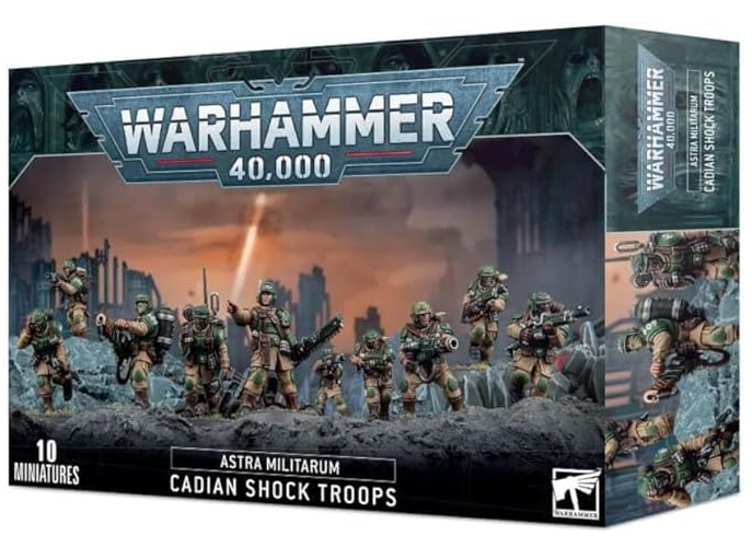 This multipart plastic kit builds 10 Cadian Shock Troops – the core of many Astra Militarum regiments. Each Shock Trooper is armed with frag grenades and a reliable lasgun, led by a Sergeant armed with either a drum-fed autogun, or a chainsword with a laspistol or bolt pistol. The kit also includes a variety of special weapons to equip your Shock Troopers – a flamer, grenade launcher, meltagun, and plasma gun – as well as a vox-caster for battlefield communications.