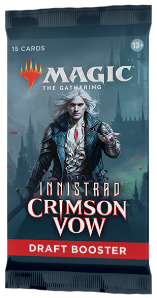 DESCRIPTION: The Innistrad: Crimson Vow Draft Booster contains 15 Magic cards, 1 token or ad card, and 1 Helper card, with 1 Rare or Mythic Rare, 3 Uncommons, 10 Common cards, and 1 Land card. A traditional foil card of any rarity replaces a Common in 33% of Innistrad: Crimson Vow Draft Boosters.