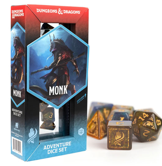 Master your inner peace with the officially licensed Dungeons & Dragons Adventure Dice Set for Monks. This set is crafted to embody the discipline and agility of the Monk, with 14 dice tailored for delivering rapid strikes and harnessing spiritual energy. Whether you're deflecting incoming attacks or unleashing blows on your enemies, these dice will elevate your Monk's abilities in every encounter.