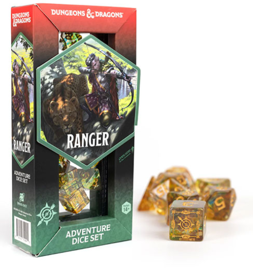 Track your prey with the officially licensed Dungeons & Dragons Adventure Dice Set for Rangers. This green and multi-colored set is crafted to capture the versatility and sharp instincts of the Ranger, with 14 dice perfect for precision strikes and navigating the wilds. Whether you're hunting down foes or leading your party through treacherous terrain, these dice will sharpen your Ranger’s skills with every roll.