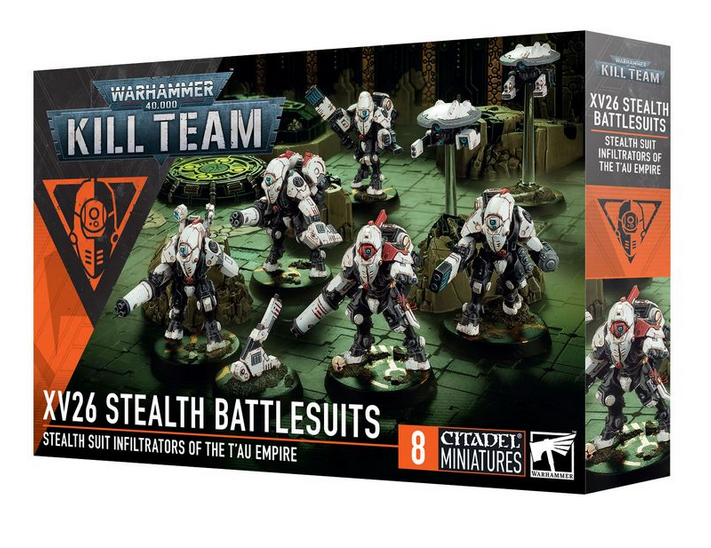 This multipart plastic kit builds eight XV26 Stealth Battlesuits operatives. These miniatures can be used as chameleonic XV26 Stealth Battlesuits warriors in games of Kill Team, or fielded in a T'au Empire army in games of Warhammer 40,000. The kit includes options, accessories, and different heads to customise your kill team, plus components to build specialists like the signal-jamming Neutraliser, camouflaged Infiltrator, maverick Lodestar, and more.Inside the box, you will also find a sheet of 38 double-sided XV26 Stealth Battlesuits tokens, so you can easily keep track of your equipment and in-game effects in the heat of battle.This kit is supplied with 1x T’au Empire Infantry Decals – Vior’la Sept Transfer Sheet, containing 177 high-quality waterslide transfers. These include symbols for Stealth Battlesuits and other T’au Empire units, including Pathfinder Teams, XV95 Ghostkeel Battlesuits, and more.This kit comprises 105 plastic components, 3x Citadel 28.5mm Round Bases, 5x Citadel 32mm Round Bases, and 2x Ball Socket Stems. These miniatures require assembly and are supplied unpainted