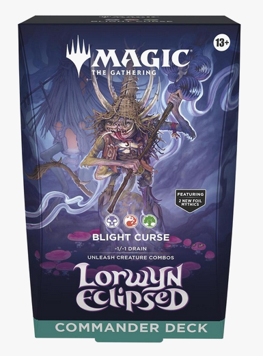 Commander decks are ready to play right out of the box and contain everything you need to play Magic's most popular multiplayer format. Lorwyn Eclipsed features two different Commander deck versions.