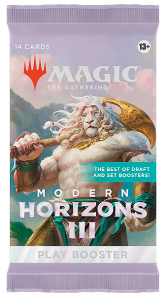 Modern Horizons 3 brings a heaping helping of exciting new cards to Modern, one of Magic's most celebrated formats. Whether your players haven't picked up a set in a while or are card-slinging veterans, there's something for everyone to love. Play Boosters are the ideal booster for the play environment—especially Limited format events. Plus, they're a thrilling pack-opening experience, providing players the opportunity to snag multiple Rare cards or even one or more possible Booster Fun treatments. Contents: • 14 Magic: The Gathering cards • 1-5 cards of rarity Rare of higher • 3-6 Uncommon cards • 5-9 Common cards • 0-1 Land card (Traditional Foil Land replaces a Land in 20% of boosters) • 1 card of any rarity is Traditional Foil; Borderless Fetch Land in <1% of boosters