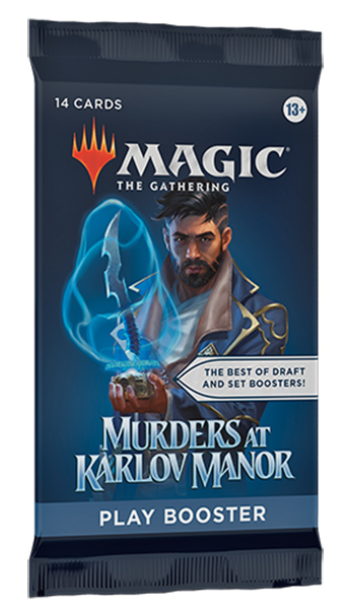 Murder! Mystery! Magic! A string of alarming murders streaks across the plane of Ravnica, and your players will step into the shoes of Ravnica's greatest detectives to track the clues and crack the case. Will they uncover the mastermind before it's too late? If solving one case isn't enough for your players, there are even more puzzles to be solved, woven into the Murders at Karlov Manor products. Let your players put their detective skills to the test! Play Boosters are the ideal booster for the play environment—especially Limited format events. Plus, they're a thrilling pack-opening experience, providing players the opportunity to snag multiple Rare cards or even a possible Booster Fun treatment. Contents: • 14 Magic: The Gathering cards • 1 Token/Ad card, Suspect Punchout card, or Art Card. (Regular Art Card found in 30% of packs. Foil-stamped Signature Art Card in 5%.) • Every pack includes a combination of 1–4 cards of rarity Rare or higher and 3–6 Uncommon, 6–9 Common, and 1 Land cards (Full-Art Land in 33% of packs). One card of any rarity is Traditional Foil. The Land card is also Traditional Foil in 20% of boosters. • Rulebook not included.