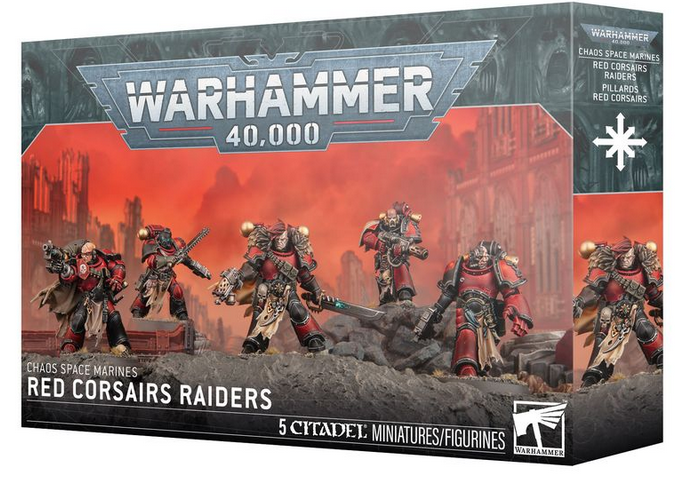 This multipart plastic kit builds 5 Red Corsairs Raiders, piratical renegades for your Chaos Space Marine armies in games of Warhammer 40,000. These battle-brothers have adapted their killing skills to the art of the raid and make an ideal core for a Red Corsairs force. As befits their piratical nature, they are equipped with a motley collection of weapons and armour, which they have scavenged from defeated foes.One of the Red Corsairs can be built as an optional champion, armed with a hand flamer or bolt pistol, and with a choice of 2 heads – helmeted or bare. Another can optionally be armed with a power fist, and there are also two optional narrative poses – throwing a grenade and carefully aiming a bolt pistol. There are also interchangeable weapons and head options, making it easy to customise your pillaging warriors.The kit comes with these interchangeable parts:– 5 helmeted heads– 9 bare heads– 6 shoulder pads with Red Corsairs iconography– 10 shoulder pads– 2 right-armed chainswords– 1 right-armed chainaxe– 3 left-armed bolt pistols– 3 pairs of arms with boltguns– 1 pair of arms with either a boltgun or meltagunThis kit is supplied with 1 Red Corsairs Transfer Sheet, featuring 248 high-quality waterslide transfers. These include a selection of infantry and vehicle-sized transfers depicting Red Corsairs iconography, skulls, kill tallies, and other cursed sigils.This kit comprises 109 plastic components and 5 Citadel 32mm Round Bases. These miniatures require assembly and are supplied unpainted