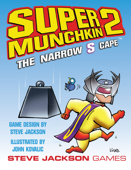 There comes a time in every munchkin's career when he's taken on more than he can handle, bitten off more than he can chew, gotten in over his head. It's time for – the Narrow S Cape. With 112 cards to enhance your Super Munchkin game, The Narrow S Cape is much more than just this season's favorite fashion accessory! It teems with new villains like the contemptible Cheese Wiz, Gothzilla (with earthquake-causing platform boot action!), and the Ratwoman. And lest you feel overwhelmed by villainy, this expansion also features new items, new Powers and a new Class: the Brain! Wield the Slide Rule and Power Ring against Sister Blister! Tackle Tackyman with the Trampoline! Endure the Two-Hour Monolog because you were Raised By Armadillos!